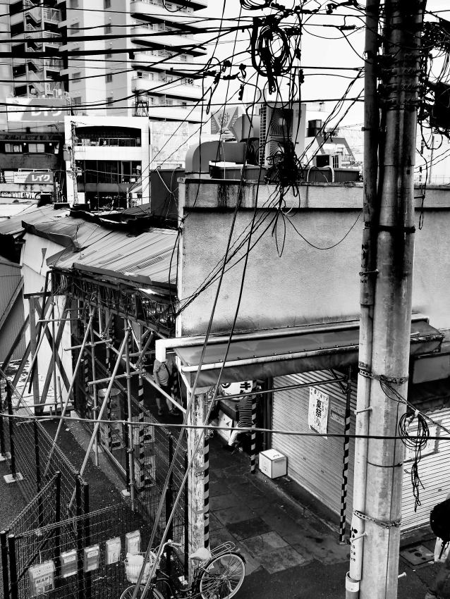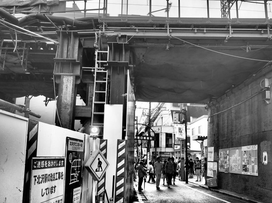 地上にあった下北沢駅の駅舎や線路があった部分。クライミングクレーンが組み立てられ、それなりに高い建物の建設が始まろうとしているようだ。幌の向こうには下北澤駅前食品市場の解体が進んでいる。権利関係の複雑さを反映してか、解体も部分的に限りなく緩慢に進んでいる。
