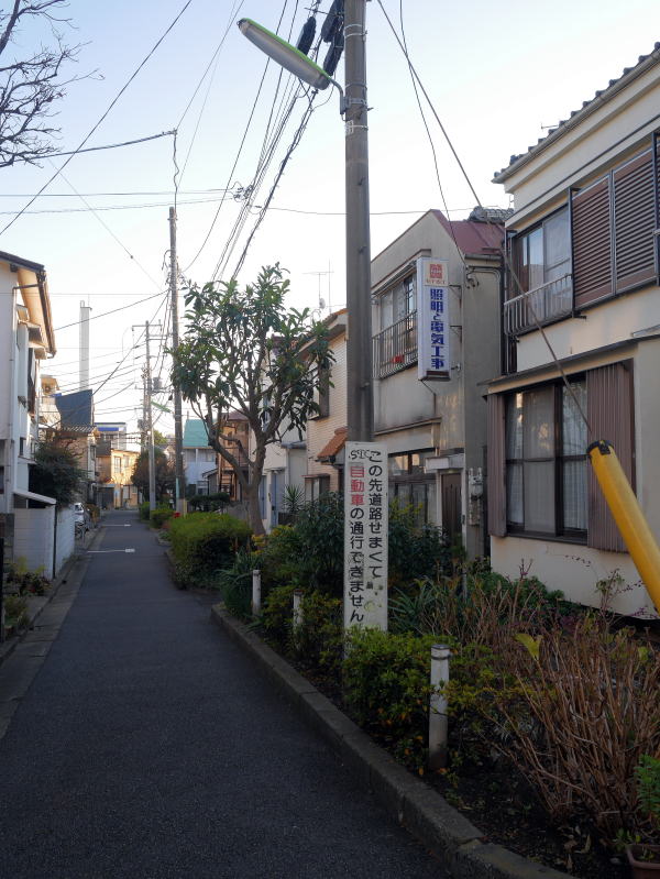 ![]() 茶沢通りから南を望む川跡。小生が松蔭幼稚園へ通っていた時代は幅2メートルほどの開渠で、 所々、木板で蓋がされていた。奥に見える煙突は石川湯の煙突。川沿いの銭湯だったことが分る。 |