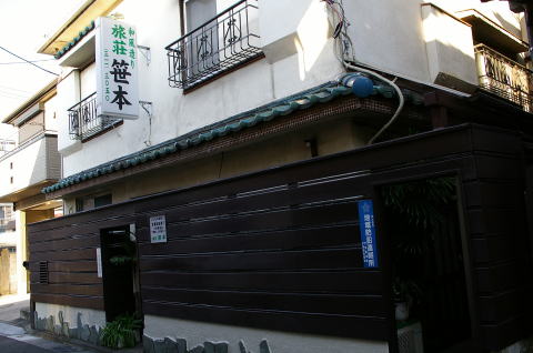 ![]() 旅荘笹本(昭和30年築) 向いの駐車場に昭和6年築の本館があって、岩風呂が設えられていた。 |