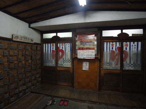 番台へ通じる扉の向こうには、男女とも長い暖簾がカーテンの代わりとして下げられている。その サッシの扉を開けると、スキンヘッドの大将が迎えてくれる。50歳というから小生とさほど変わら ない年齢だ。奈良県の銭湯料金は350円。