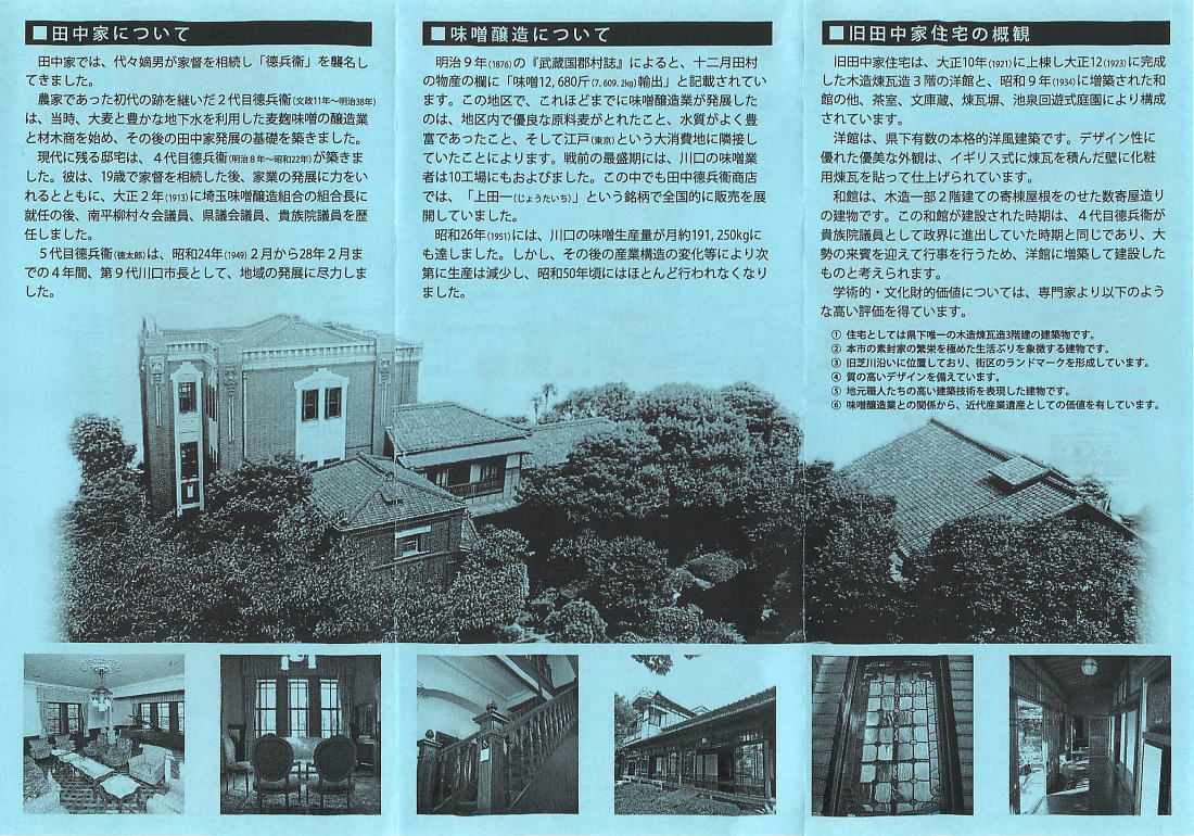 材木と味噌で財をなした川口の豪商で川口市長まで務めた田中氏の旧宅。現在は川口市に寄贈され、「川口市文化財センター分館」となっている。