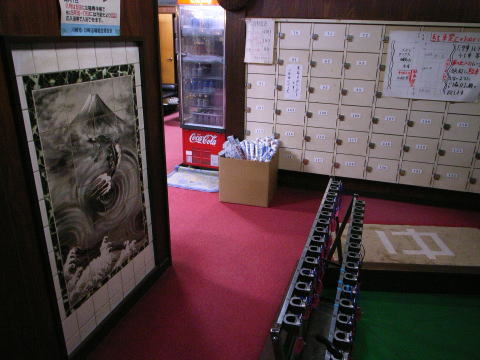 自動ドアを入ると、下足スペース。下足箱は鍵が小さな板鍵のもの。そして、正面のかつての番台裏に、見事なタイル絵がある。