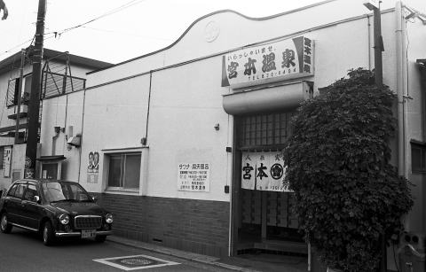 宮本温泉は、モルタルのファッサードに、家紋、オリジナル暖簾の銭湯。人参実母散の露天風呂やサウナもあるようだった。