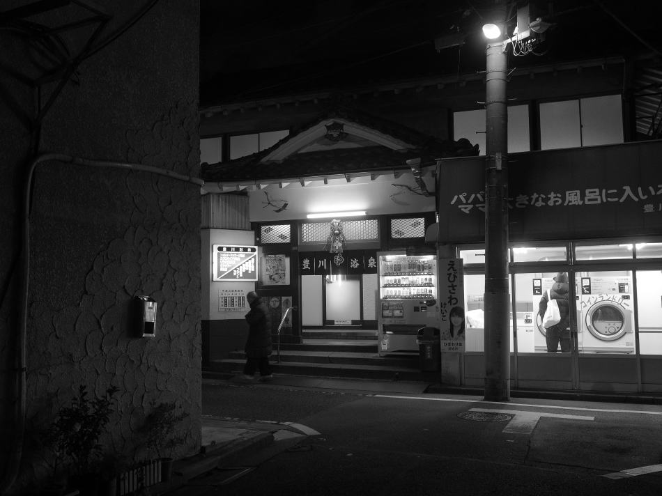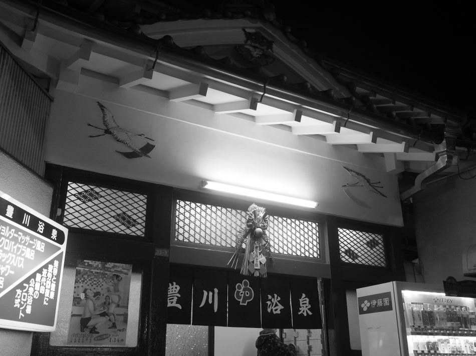 差出人: Masayuki Nakamura ナカムラです。 今日(1/6)は、「豊川浴泉(文京区目白台)」に行ってきました。 目白台の傾斜地を小布施坂を神田川へ下った辺り。同湯の脇は、坂の上から神田川の先までが既に 更地になっている。以前来た時に比べ立ち退きが進んでいる。目白台の坂の上から同湯を掠め、西 早稲田方面に繋がる環状4号線の予定地になっている。 同湯は文京区と豊島区の境。かつて蛇行していた神田川の前の流れが新宿区との区境でもあり、付 近は3区が複雑に絡み合っている。同湯の前の緩やかに曲がる道の風情がいい。江戸時代の地図に は既に描かれている、古い道のようだ。 ”目白御殿”と呼ばれた同湯の建物は昭和24年築の伝統的木造銭湯。能登出身の先代が下足番から はじめ、同湯を皮切りに何軒もの銭湯を経営した。株売買で財をなし今でも坂に名を残す小布施新 三郎〈初代・二代目〉が一帯の地主で、先代は同湯を建てる際に兜町の小布施商店まで権利証を受 取りに出かけて行ったという。 旧町名は高田豊川町。豊川稲荷から来ているのだろう。創業時より引き継がれている建物は、その ままで磨き込まれている。鶴の美しい鏝絵があしらわれたエントランスには立派な正月飾りととも に、紺地染め抜きのオリジナル暖簾が掛る。 脱衣所の折り上げ格天井は一見していい材料で造られていることがわかる。さらに、乳白色のガラ ス球の電笠を組み合わせた和風シャンデリアともいえる照明器が、古い三翼の天井扇や大黒柱のい こひ工務店寄贈の黒時計とともに何とも言えない雰囲気を出している。 中島さんの西伊豆のペンキ絵がある浴室。白色のユリ模様タイルに曇りがない。初めて経験する” ユッカ濁り湯”が42度で一番の高温槽。その他の浴槽は41度と温めの設定。既にコンクリ煙突は 無く、ステンレスの低い煙突に変っているのでガス焚きのようだ。 コインランドリーのテントには”パパママと大きなお風呂に入ろうよ 豊川浴泉”と大きく記され ている。既に夕飯時を大きく回っているので子供はいなかったけど、学生街ということもあって若 い客も多い。温めのお湯で思い思いに寛いでいる感じだった。 土曜日の19:25から20:35に滞在。相客は15人くらい。坂道が多い目白台の雰囲気のいい落ち着
