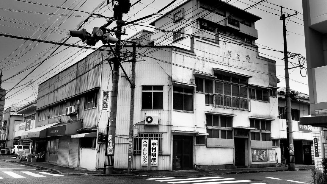 黄金町の商店街の外れ、3階建てに相当する大きな”看板”と言っていい屋号を大きく記したファッサード。窪んだエントランスの両脇には小タイル張りのピンク色の丸柱が2本。頭上には木枠の行灯型の何とも言えないレトロな温泉マークと屋号を記した看板が下がる。