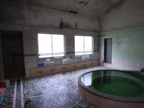 浴槽は、中心よりやや後方に直径1間半ほどの大きな円形浴槽が1槽あるのみ。ヘリに黒の小 タイルが使われた古風なものだ。お湯はバスクリンが入った42度強の入りやすいもの。底の方 から熱い湯が足されているけど、循環設備は見当たらない。