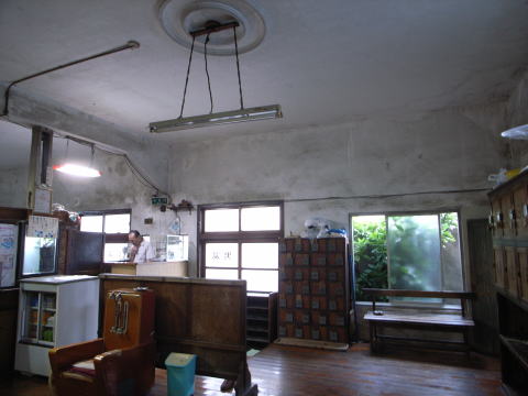 古くて頑丈そうな木枠のガラス戸を開けると、狭いコンクリのたたきに番台がある。この番台は、 基部がコンクリになっていて、その上に「番台」が載せられている。オリジナルはかなりの低さだ けど、その上に高さを付け足した跡がある。側面に傘を収納する錠がある。しかし、鍵はすべて 散逸して、機能はしていないようだ。